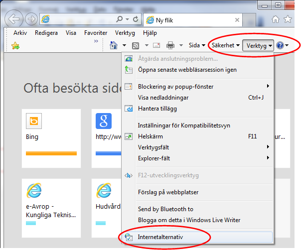 Klicka på Verktyg i Internet Explorer och välj Internetalternativ