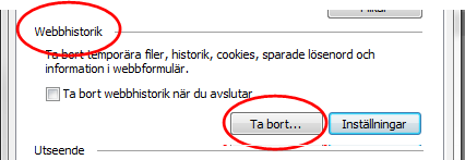 Klicka på Ta bort under rubriken Webbhistorik