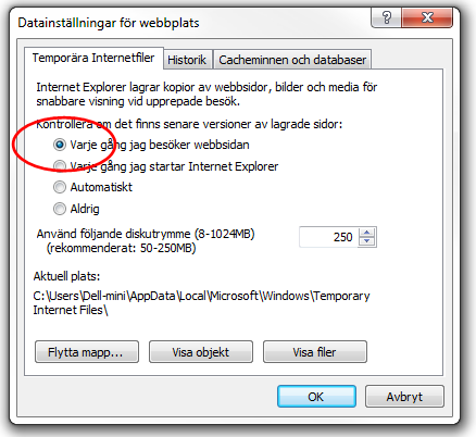 Kontrollera att översta alternativet är markerat, Varje gång jag besöker webbsidan