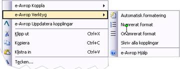 Kopplingarna kan sedan infogas i dokumentet. När dokumentet annonseras uppdateras kopplingen med rätt information från grunduppgifter och utvärdering. 1. Uppdatera kopplingarTilläggets funktioner är tillgängliga när du högerklickar i ett Word-dokument. |